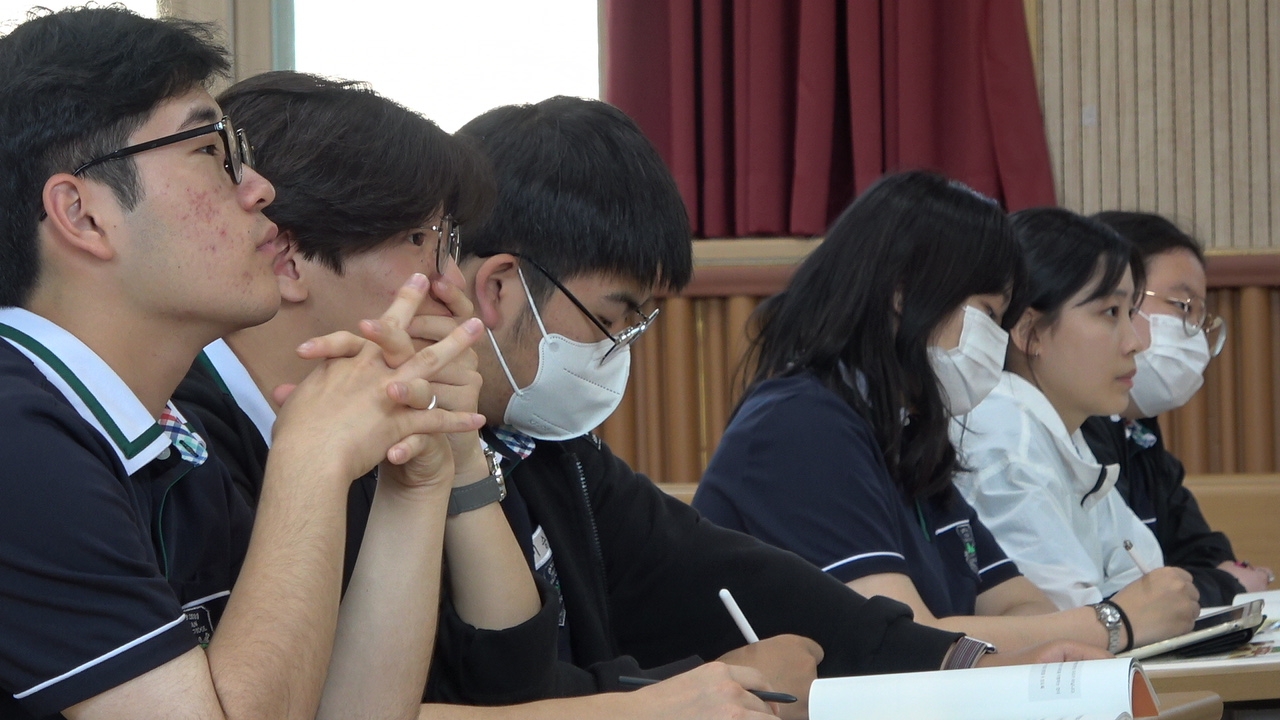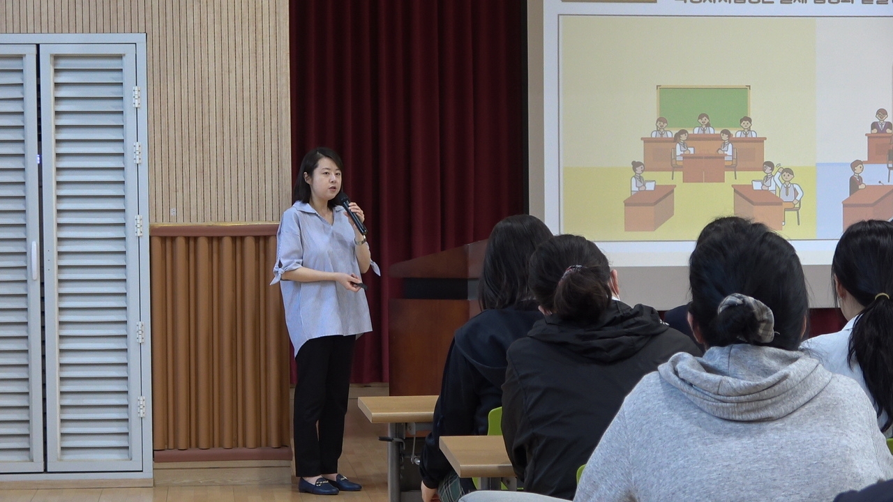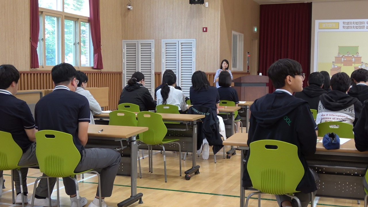 전교생은 2023년 6월 9일, 치원관에서 학생자치법정운영 특강을 들었습니다. 법교육센터의 한다희 강사님의 강의로 진행된 이번 강의에서 학생들은 법정에 필요한 구성원과 각 구성원의 역할, 그리고 주의사항을 배웠습니다.