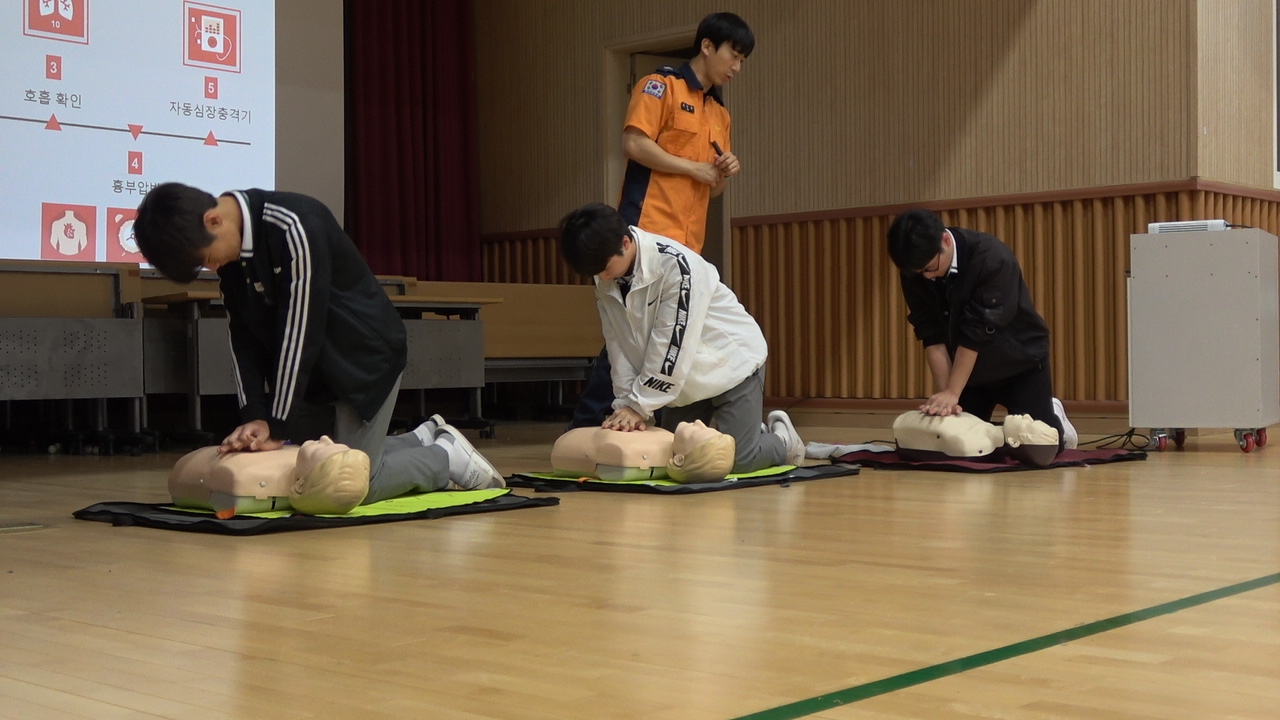 전교생은 7월 14일 심폐소생술 교육을 이수하였습니다. 심폐소생술이 정의와 여러 사고의 골든타임, 그리고 심정지환자의 특징을 알게되었습니다. 또한 직접 심폐소생술을 실시함으로써 심폐소생술을 해야하는 상황에서의 대처 방법과 심폐소생술이 필요한 이유에 대하여 알게되었습니다.